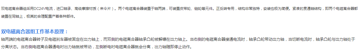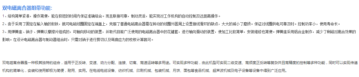 雙電磁離合器組采用DC24V電流,進(jìn)口軸承、高級(jí)摩擦材質(zhì)(來(lái)令片)。兩個(gè)電磁離合器裝置于軸兩端,可裝置皮帶輪、鏈輪等元件。正反轉(zhuǎn)專(zhuān)用,結(jié)構(gòu)非常獨(dú)特,安裝也極為簡(jiǎn)便。緊湊的貫通軸結(jié)構(gòu),即兩個(gè)電磁離合器都裝置在同軸上,極其的合理配置產(chǎn)著各種部件;