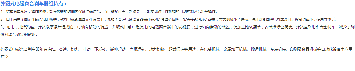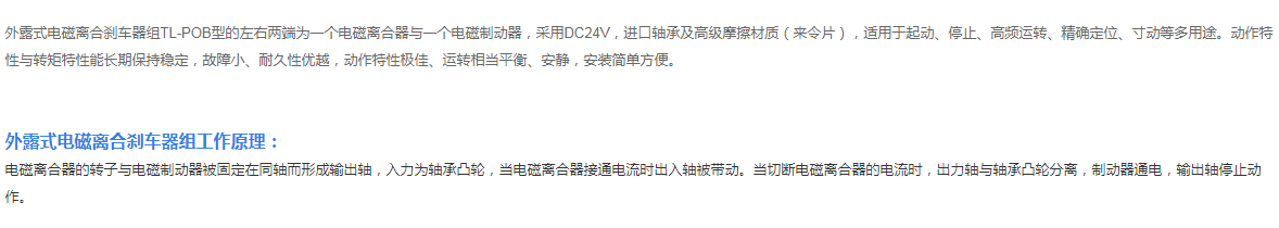 外露式電磁離合剎車器組TL-POB型的左右兩端為一個電磁離合器與一個電磁制動器,采用DC24V,進口軸承及高級摩擦材質(來令片),適用于起動、停止、高頻運轉、精確定位、寸動等多用途。動作特性與轉矩特性能長期保持穩定,故障小、耐久性優越,動作特性極佳、運轉相當平衡、安靜,安裝簡單方便。