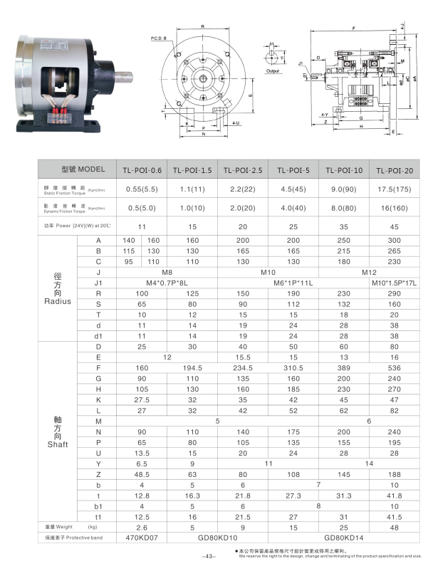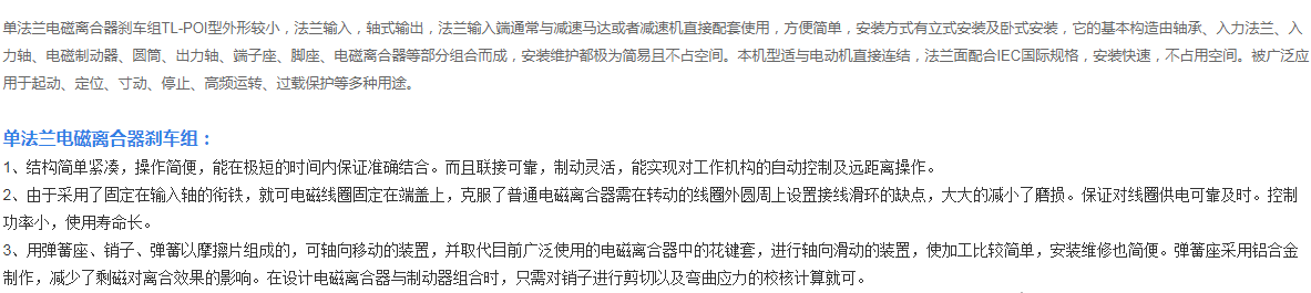 單法蘭電磁離合器剎車組TL-POI型外形較小,法蘭輸入,軸式輸出,法蘭輸入端通常與減速馬達或者減速機直接配套使用,方便簡單,安裝方式有立式安裝及臥式安裝,它的基本構造由軸承、入力法蘭、入力軸、電磁制動器、圓筒、出力軸、端子座、腳座、電磁離合器等部分組合而成,安裝維護都極為簡易且不占空間。