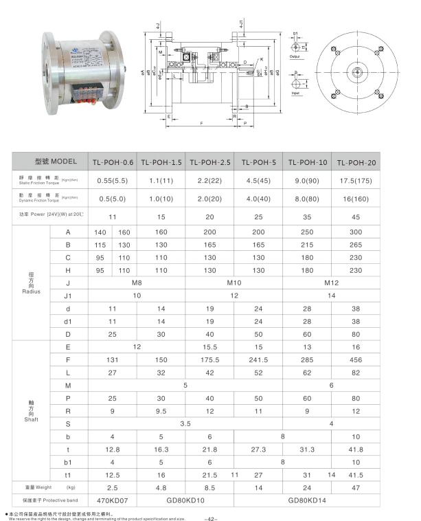 雙法蘭電磁離合剎車器組TL-POH型它的基本構造由軸承、入力法蘭、入力軸、電磁制動器、圓筒、出力軸、端子座、腳座、電磁離合器等部分組合而成,安裝方式有臥式與立式。為孔式輸入(與電機連結),軸式輸出(與蝸輪蝸桿減速機連接),不需要聯軸器與其他連接元件,安裝簡單方便、節省空間成成本。