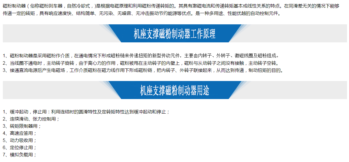 磁粉制動器(俗稱磁粉剎車器,自然冷卻式,)是根據(jù)電磁原理和利用磁粉傳遞轉矩的。其具有激磁電流和傳遞轉矩基本成線性關系的特點。在同滑差無關的情況下能夠傳遞一定的轉矩,具有響應速度快、結構簡單、無污染、無噪音、無沖擊振動節(jié)約能源等優(yōu)點。是一種多用途、性能優(yōu)越的自動控制元件。