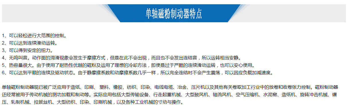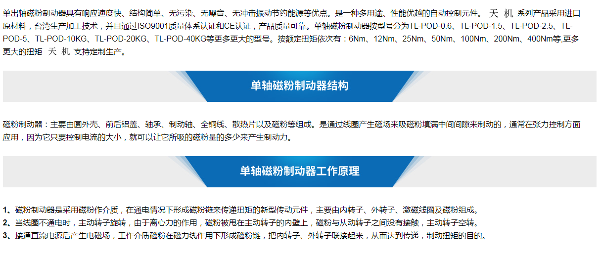 單出軸磁粉制動器具有響應速度快、結構簡單、無污染、無噪音、無沖擊振動節約能源等優點。是一種多用途、性能優越的自動控制元件。天機系列產品采用進口原材料,臺灣生產加工技術,并且通過ISO9001質量體系認證和CE認證,產品質量可靠。單軸磁粉制動器按型號分為TL-POD-0.6、TL-POD-1.5、TL-POD-2.5、TL-POD-5、TL-POD-10KG、TL-POD-20KG、TL-POD-40KG等更多更大的型號。按額定扭矩依次有:6Nm、12Nm、25Nm、50Nm、100Nm、200Nm、400Nm等,更多更大的扭矩天機支持定制生產。