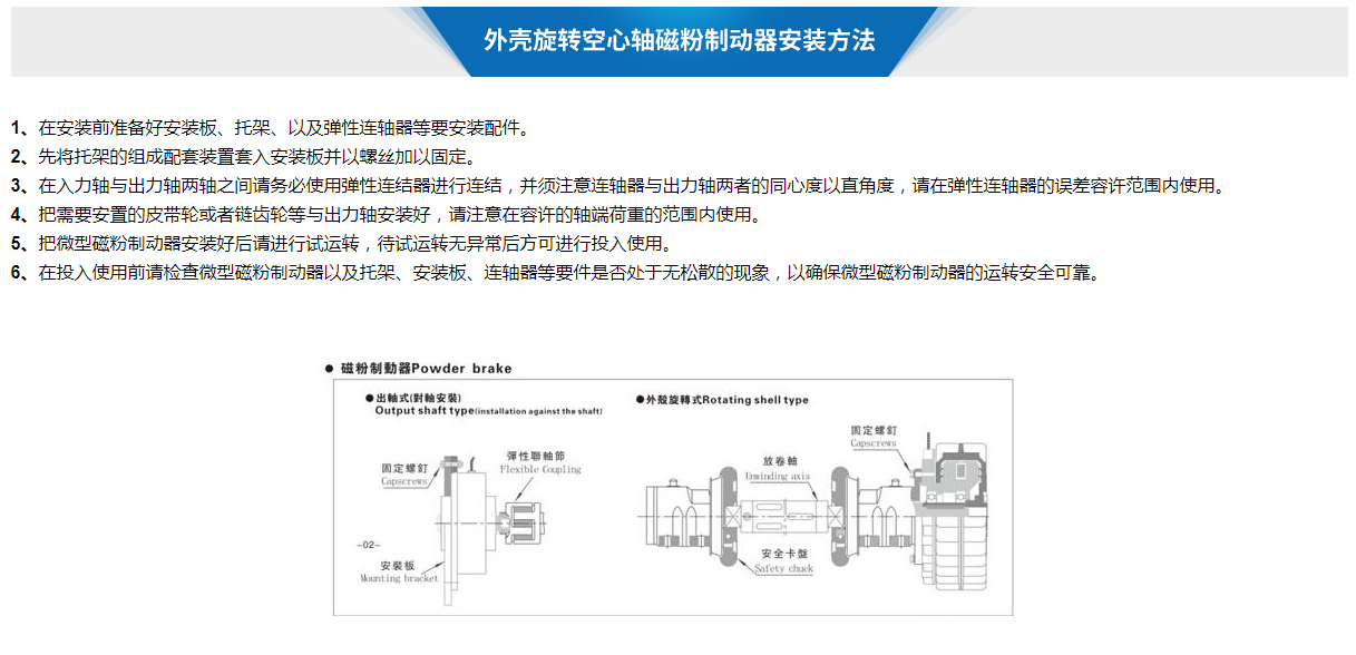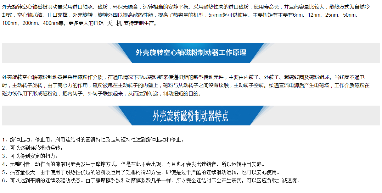 外殼旋轉空心軸磁粉制動器采用進口軸承、磁粉,環保無噪音,運轉相當的安靜平穩、采用耐熱性高的進口磁粉,使用壽命長,并且熱容量比較大;散熱方式為自然冷卻式,空心軸聯結、止口支撐,外殼旋轉,旋轉外圍以提高散熱性能,提高了熱容量的機型,5r/min起可供使用。主要扭矩有主要有6nm、12nm、25nm、50nm、100nm、200nm、400nm等。更多更大的扭矩天機支持定制生產。