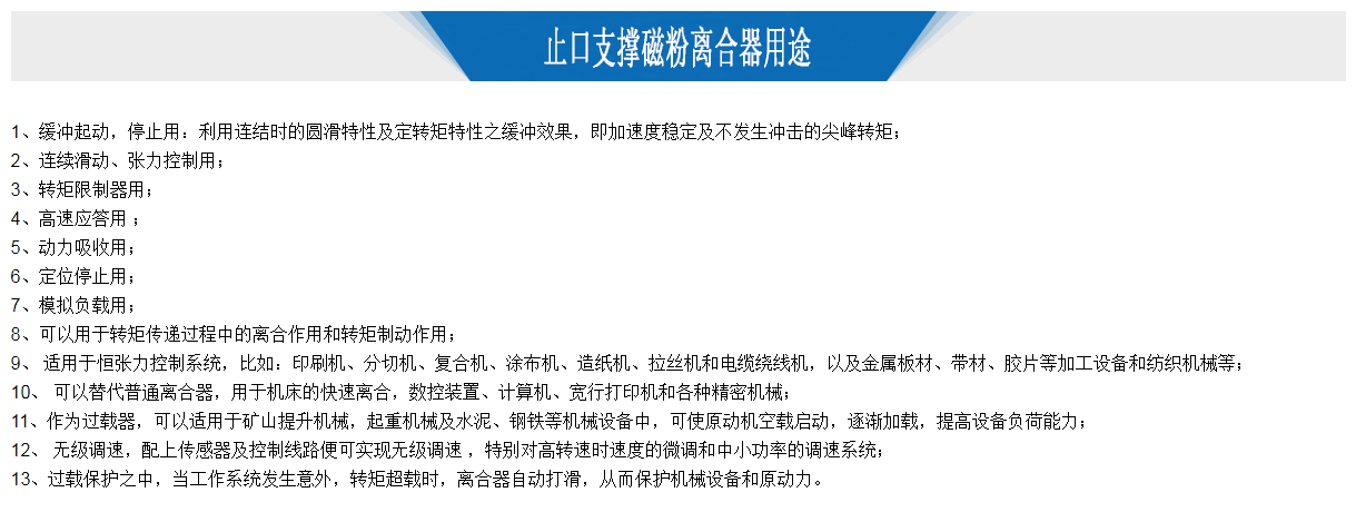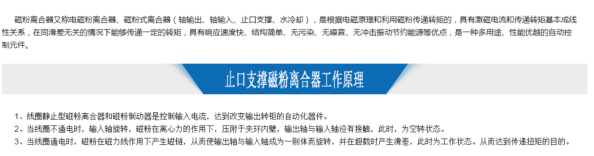 磁粉離合器又稱電磁粉離合器、磁粉式離合器(軸輸出、軸輸入、止口支撐、水冷卻),是根據電磁原理和利用磁粉傳遞轉矩的,具有激磁電流和傳遞轉矩基本成線性關系,在同滑差無關的情況下能夠傳遞一定的轉矩,具有響應速度快、結構簡單、無污染、無噪音、無沖擊振動節約能源等優點,是一種多用途、性能優越的自動控制元件。