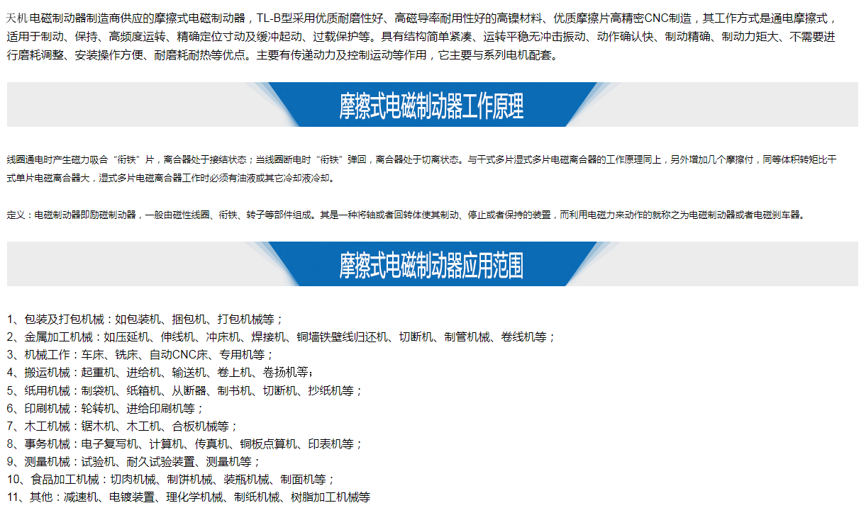 天機電磁制動器制造商供應的?摩擦式電磁制動器,TL-B型采用優質耐磨性好、高磁導率耐用性好的高鎳材料、優質摩擦片高精密CNC制造,其工作方式是通電摩擦式,適用于制動、保持、高頻度運轉、精確定位寸動及緩沖起動、過載保護等。
