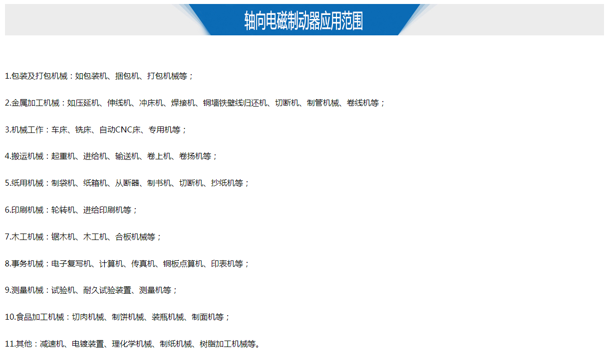 軸向電磁制動器,它使用DC24V,由定子、板型彈片、銜鐵(電樞板)、磁性線圈、來令片、鋁導座等元件構成,標準規格有0.6-40KG等等。(非標規格可定制生產)