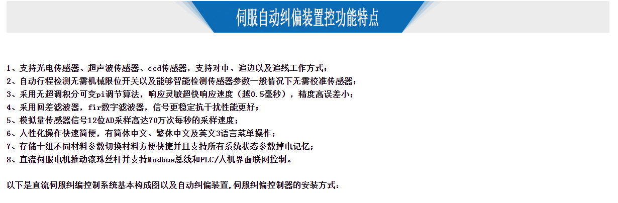 伺服自動糾偏裝置,伺服糾偏控制器采用無超調積分可變pi調節算法及高速32位主頻72M的cpu驅動直流伺服電機,響應超快越每分鐘2000次。
