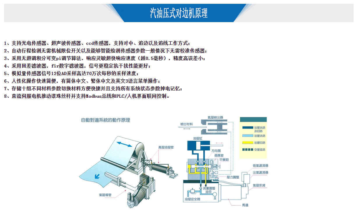汽油壓式對邊機,金牌對邊機采用無超調積分可變PI調節算法,精度高,反應敏捷,誤差更小;模擬量傳感器信號12位AD采樣高達70萬次每秒的采樣速度。