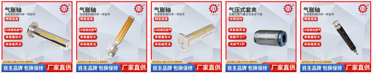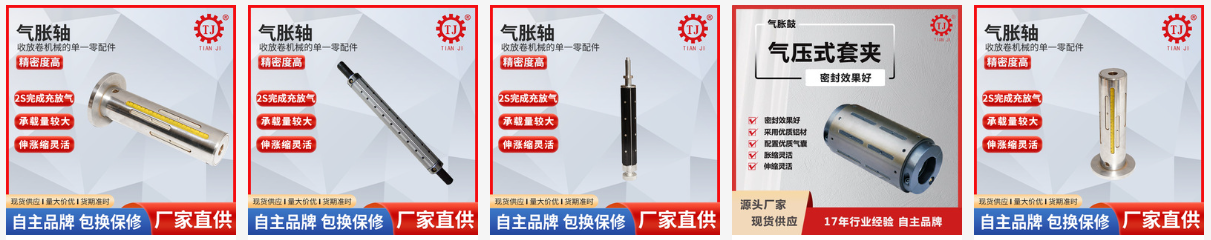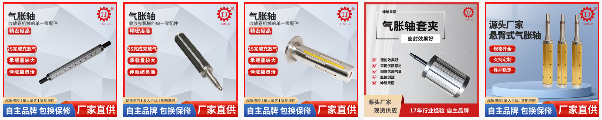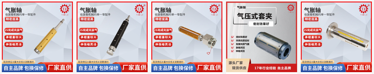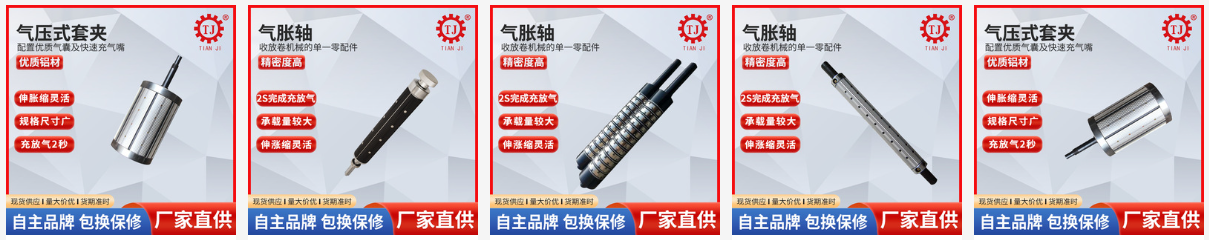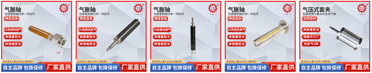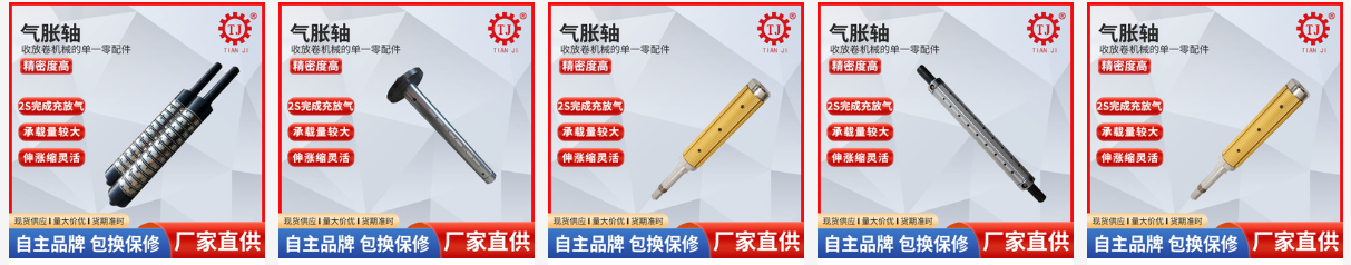(氣漲軸)漲緊軸生產廠家生產的氣脹軸氣漲軸主要由前套、后套、氣缸、內管、氣囊、凸形鍵盤等部分組成,氣漲軸膨脹套由表面氧化的優質鋁制成,氣漲軸(氣脹軸)配有優質氣囊和快速充氣嘴。氣漲(氣脹軸)軸密封效果好,氣漲軸(氣脹軸)使用壽命長,氣漲軸(氣脹軸)維護方便。