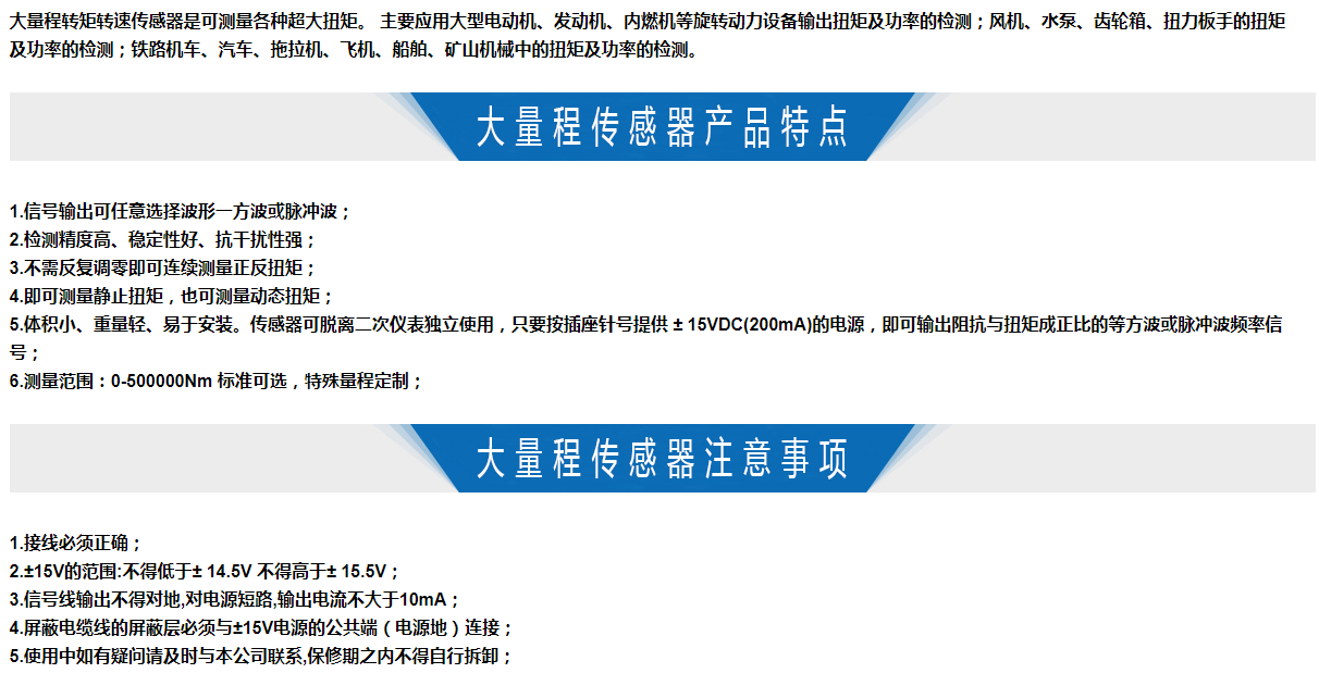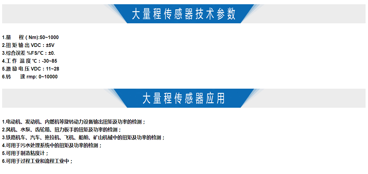 大量程轉矩轉速傳感器是可測量各種超大扭矩。 主要應用大型電動機、發動機、內燃機等旋轉動力設備輸出扭矩及功率的檢測;風機、水泵、齒輪箱、扭力板手的扭矩及功率的檢測;鐵路機車、汽車、拖拉機、飛機、船舶、礦山機械中的扭矩及功率的檢測。