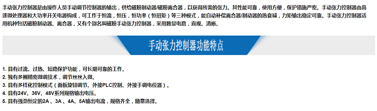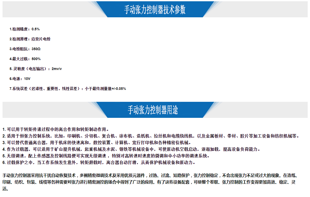 手動張力控制器是由操作人員手動調節控制器的輸出,供給磁粉制動器/磁粉離合器,以獲得所需的張力。其性能可靠,使用方便,保護措施嚴密。